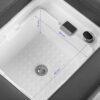 Wyposażenie obejmuje baterię z mieszaczem do regulacji temperatury, miejsce na słuchawkę natryskową oraz korek z sitkiem kontrolującym przepływ wody. Przyłącza zostały estetycznie ukryte. Pod leżanką znajduje się funkcjonalna szafka na kosmetyki i akcesoria, a dołączona pufa zwiększa komfort pracy personelu.